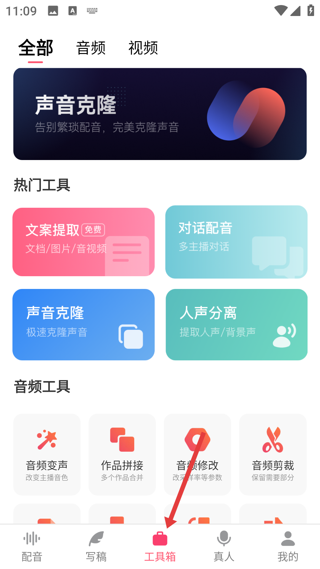 3、点击底部工具箱,里面有丰富的工具,文案提取可从文档等中提取文案,声音克隆能克隆声音,以及还有音频变声、拼接、修改、剪裁等音频工具。
