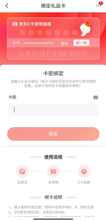 2、E卡在成功绑定后,不能解绑,不能重新绑定,不能跨京东账户使用;