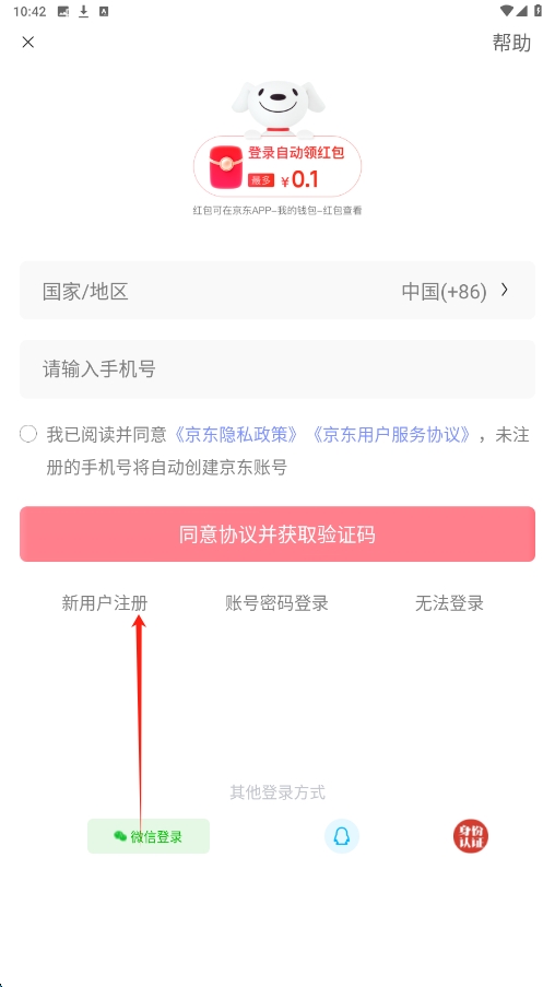 2、在登录界面,点击“新用户注册”选项,跳转至手机快速注册页面,启动账号注册流程。
