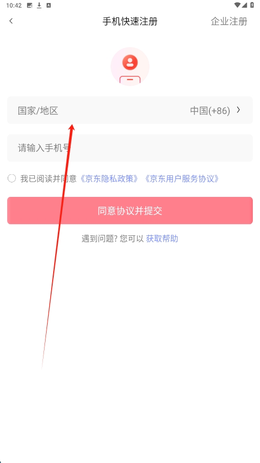 3、进入手机快速注册页,确认国家/地区为中国(+86),随后在下方输入框准备填写手机号码,推进注册步骤。