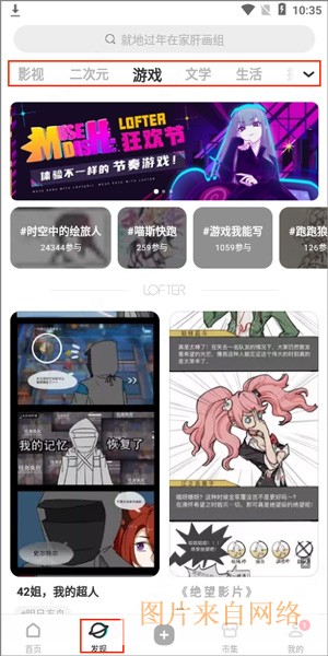3、发现功能中玩家能够与其他的用户一同参与有关影视、生活、游戏、二次元、文学等用户感兴趣的话题;