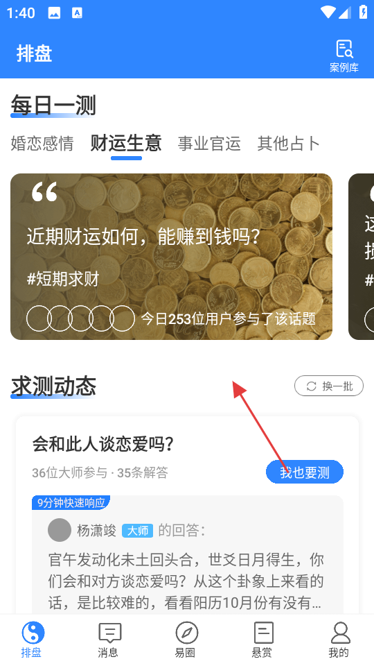 3、切换至APP排盘外板块,查看每日一测的财运等话题及参与人数,浏览求测动态里的他人提问和大师解答,点击我也要测按钮发起个人测算申请。
