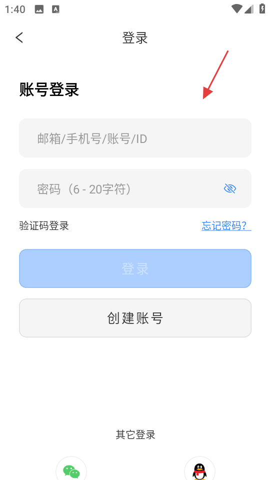 2、打开APP登录界面,在账号栏输入邮箱或手机号等内容,填写六到二十字符密码,也可选择验证码登录,未注册则点击创建账号,完成认证进入应用。