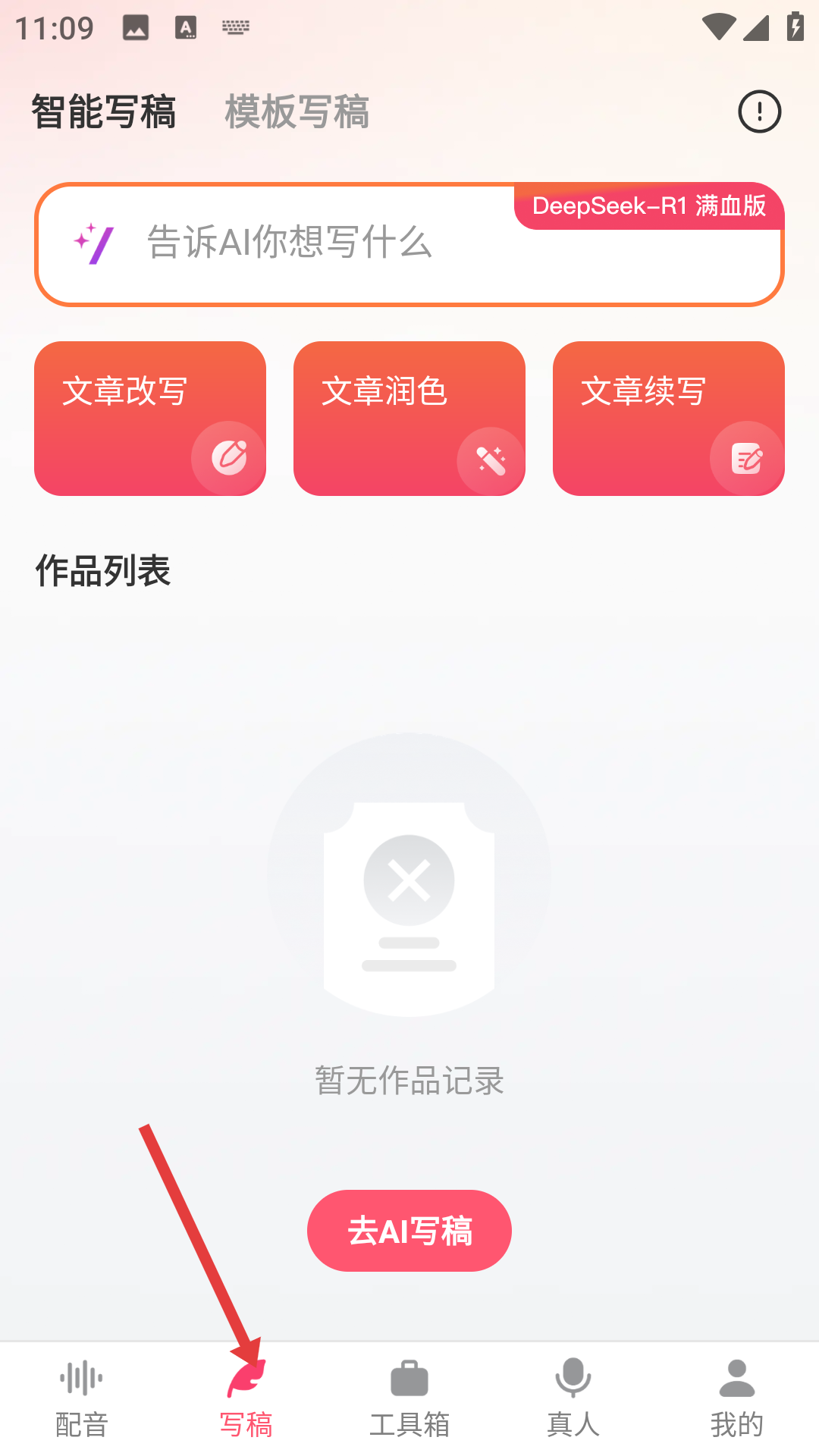 2、点击底部写稿按钮进入写稿页面,可以选择智能写稿或模板写稿,还能进行文章改写、润色、续写等操作完成创作后,可在作品列表查看和管理稿件。